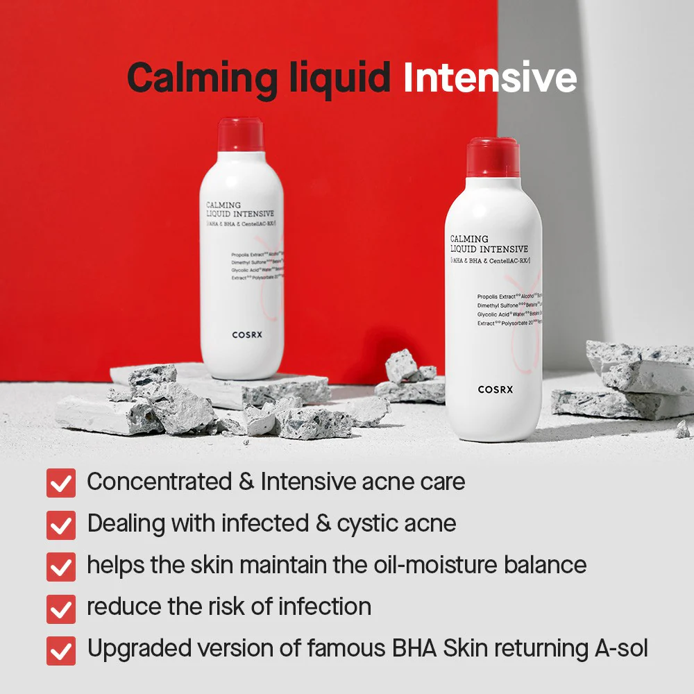 سائل/تونر مكثّف مخصص للبشرة المعرضة لـ حبّ الشباب. يعمل على تهدئة، معالجة، ومنع ظهور البثور باستخدام مكونات أساسية مثل BHA، AHA، مركّب سنتيلا AC-Rx. بعد التنظيف، ضعيه بواسطة قطعة قطن أو بيديك بلطف على البشرة ثم تابعي بالسيروم والمرطّب الاعتيادي.